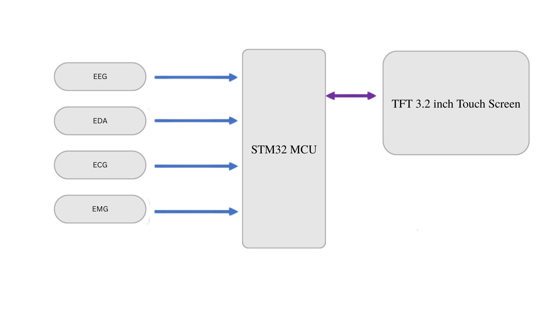 This project focuses on the development of a portable biomedical signal monitoring system using the BITalino sensor platform and STM32F429 Discovery Board. The device is capable of capturing four physiological signals: ECG (electrocardiography), EDA (electrodermal activity), EEG (electroencephalography), and EMG (electromyography). It features an embedded graphical interface developed with TouchGFX, running on FreeRTOS.